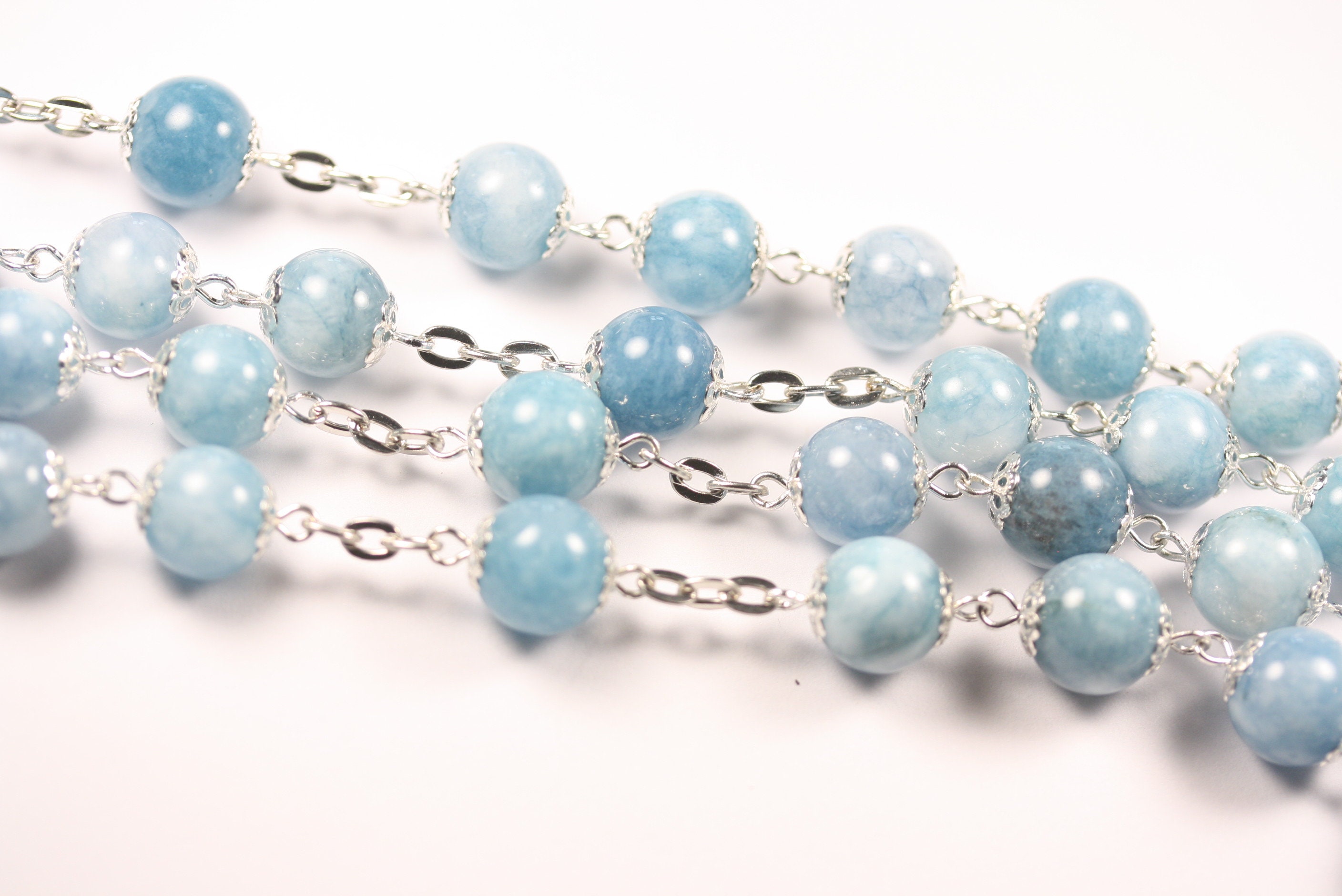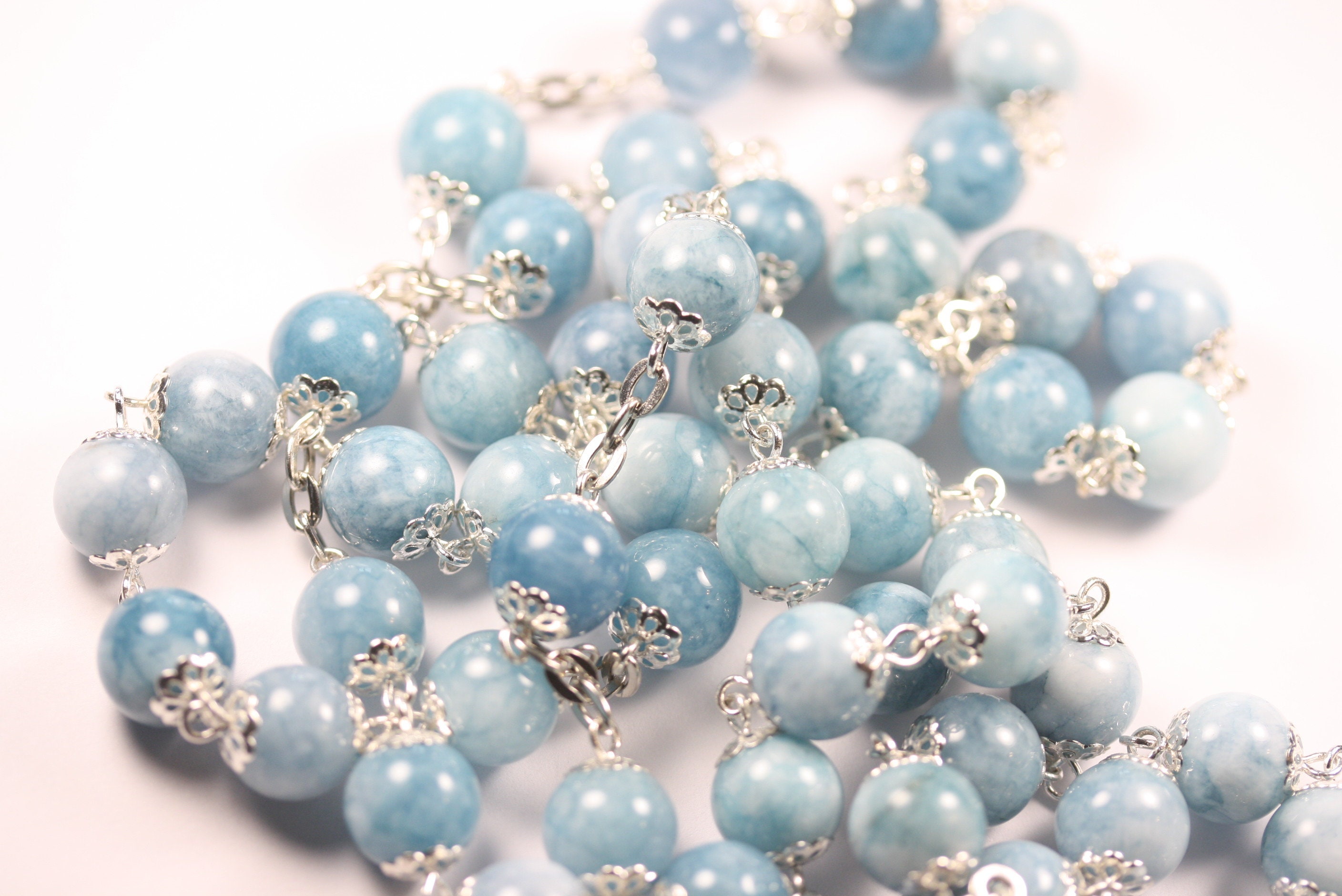 Large 10mm Light Blue Chalcedony Rosary, Silver, 5 Decade, Pardon Crucifix, Handmade in Oklahoma