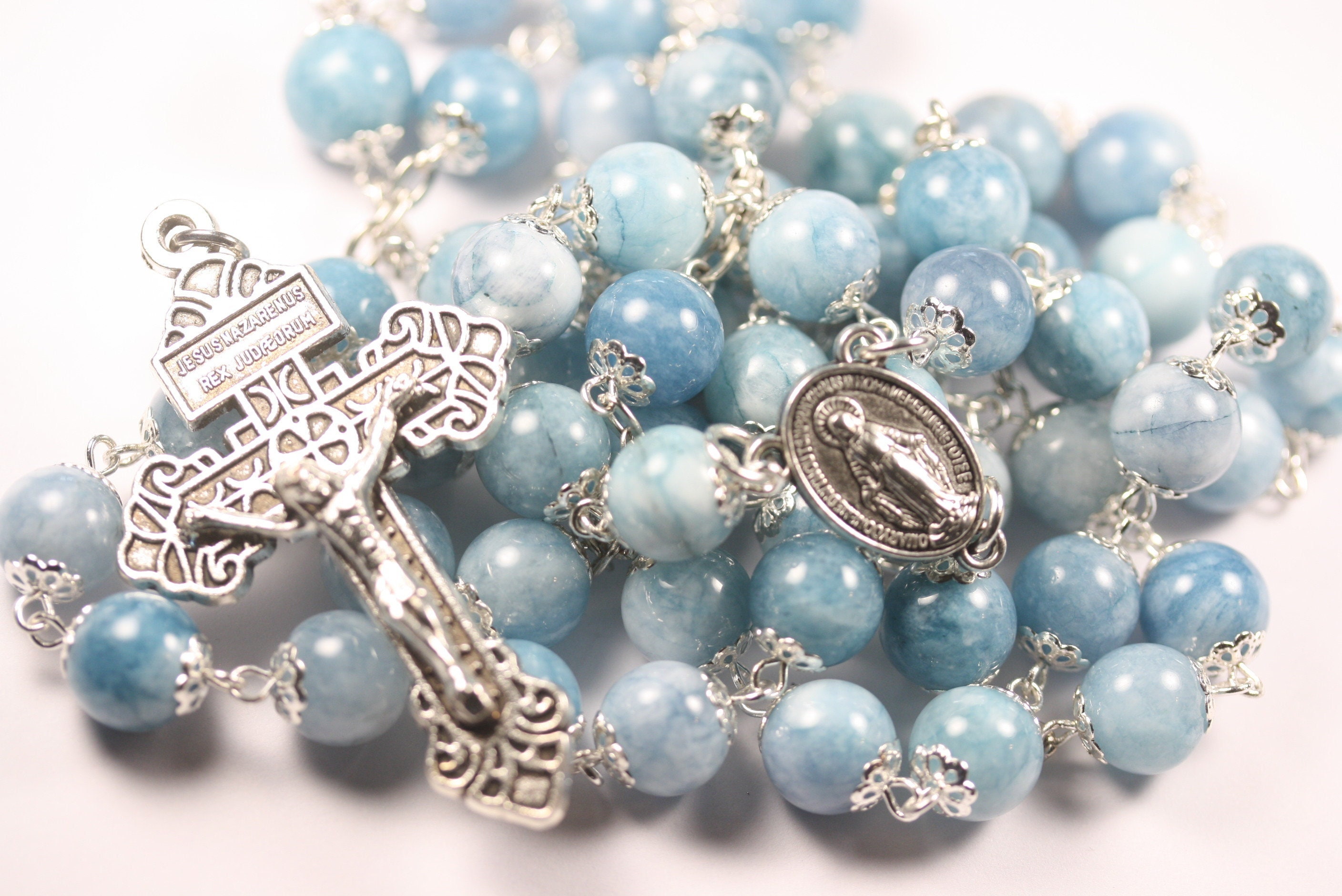 Very Large 10mm Non smooth light blue Chalcedony Rosary in Silver Handmade in Oklahoma 5 decade. Pardon crucifix and Miraculous medal center. This rosary is especially comfortable for arthritic hands to hold due to the over sized beads. Lifetime warrantee and velveteen carrying bag with charm saying "handmade".