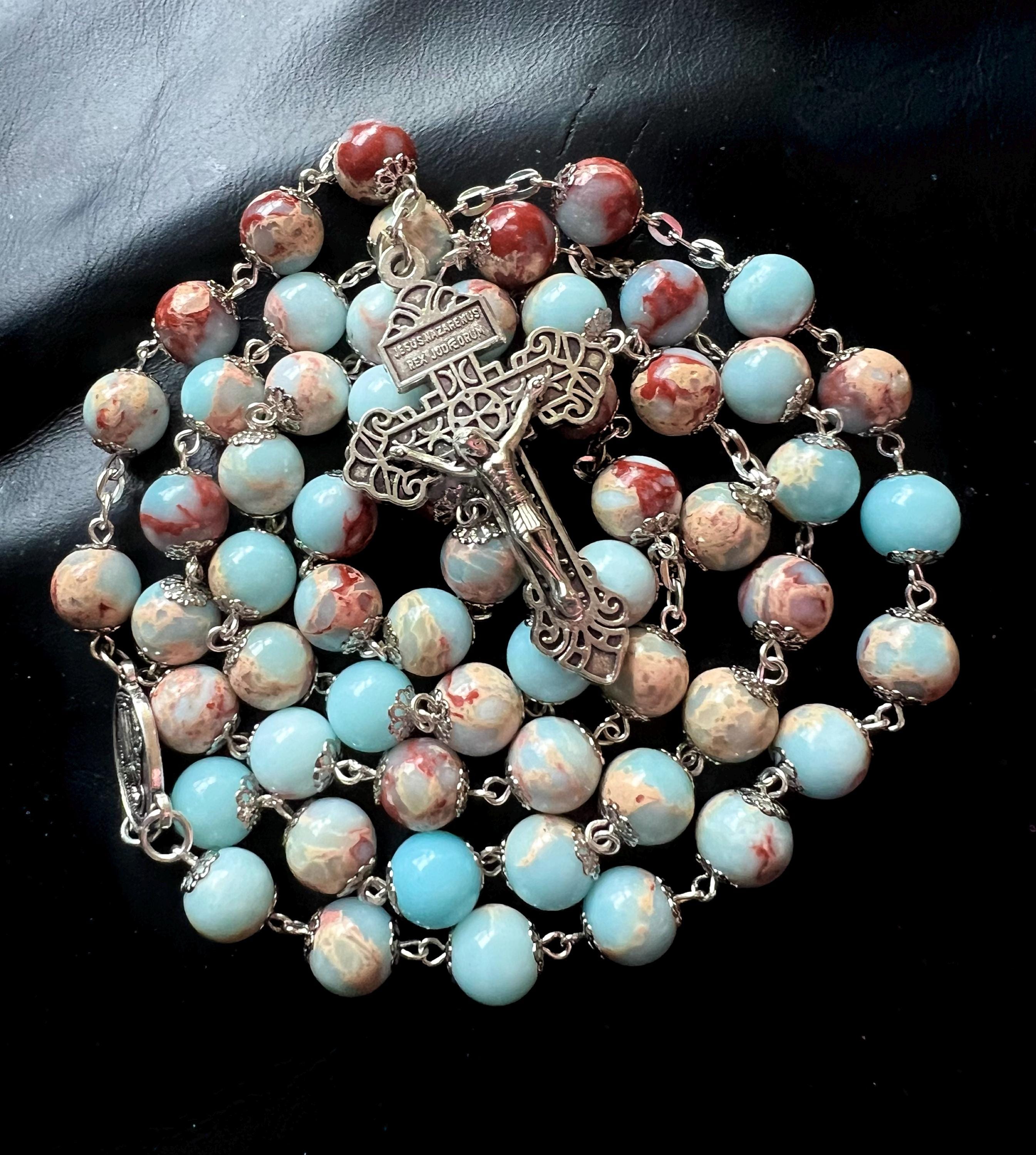 Absolutely beautiful! The beads are polished and very colorful. The silver cross, medal, and findings are well made and of good quality. The reason for 3 stars is that I left 3 different messages asking to have the Mother medal replaced for a “Michael Protect Us” and did not get a response. After seeing that it was shipped, I messaged again, to see if the replacement had been made, and was told that they did not receive any messages. I love the rosary, and will likely buy another with the Michael replacement.