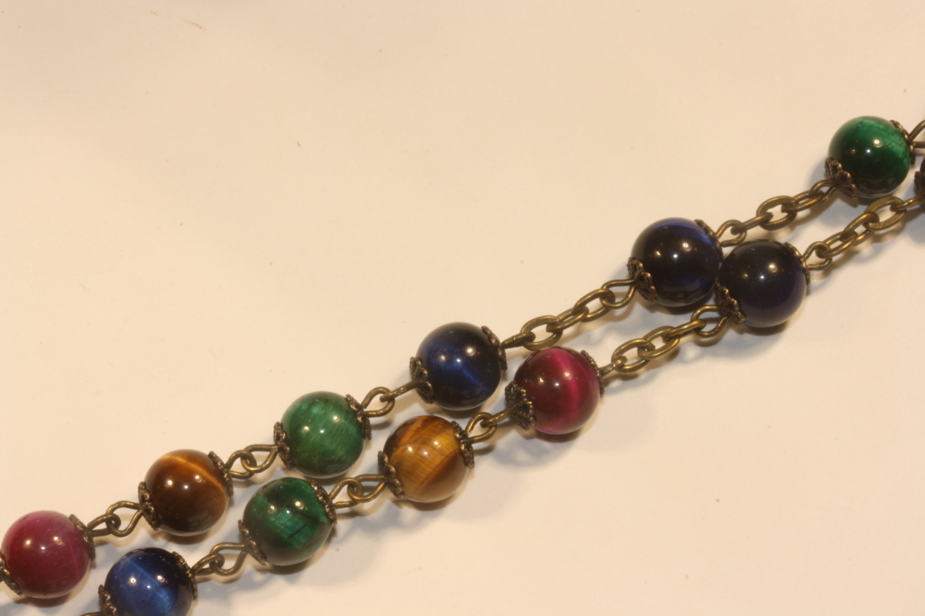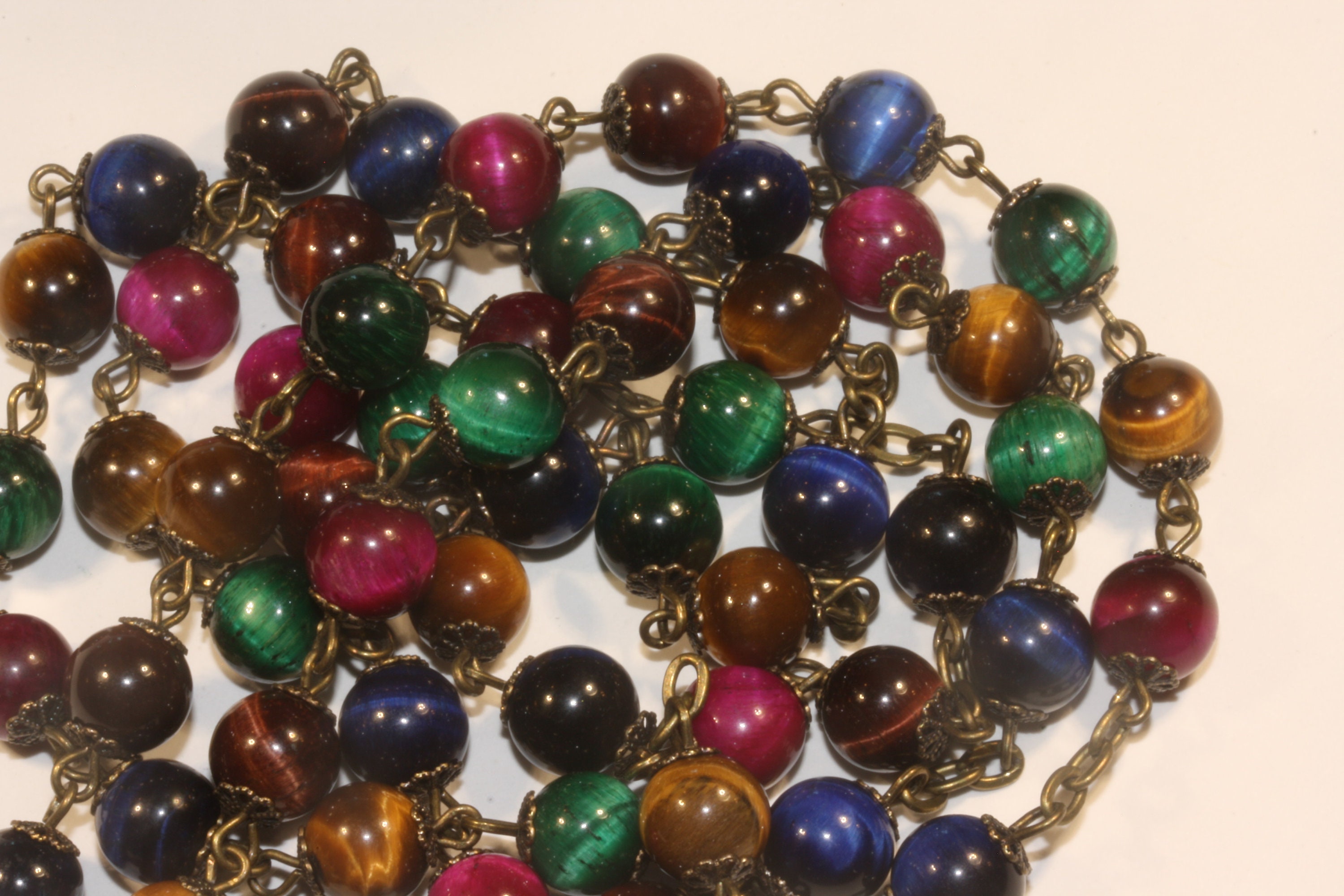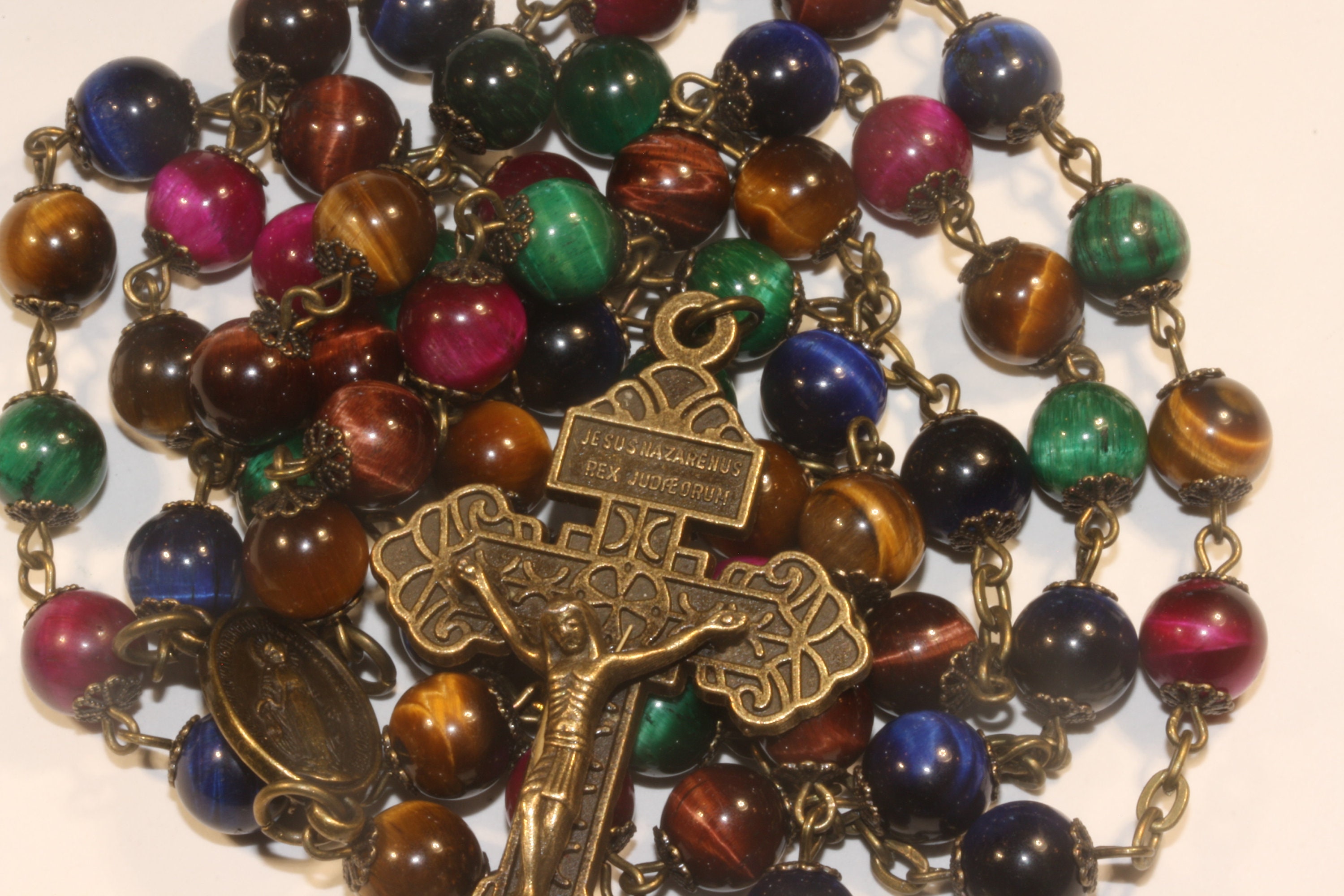 Standard sized Tiger eye rosary made with 8mm smooth beads in a convenient size to carry. Pardon Crucifix, Miraculous Medal center, and tiger eye beads complete this small but sturdy rosary.