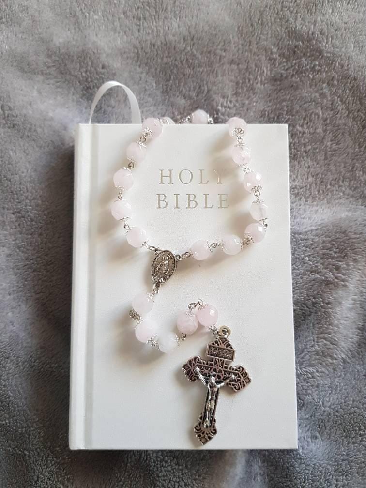 10mm Quartz Rosary made in Oklahoma is a handmade traditional 5-decade rosary. These stones have a slight pinkish gray tint. The rosary is made of large 10mm smooth stones. The Pardon Crucifix is included. Finished with the Miraculous Medal center I hope this rosary brings many hours of comfort to someone in need. This Rosary comes with a lifetime repair warranted and a velveteen carrying bag. A charm saying "handmade" is attached to the bag. I ship in one day.