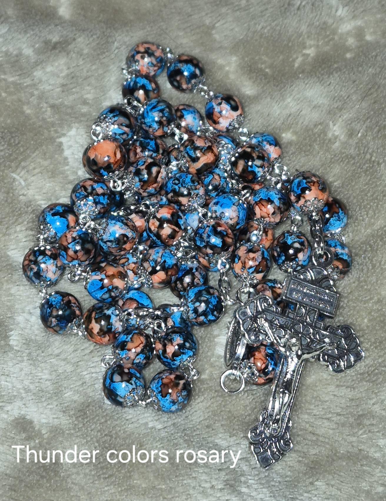 Handmade Ceramic Rosary: Blue Orange Painted Beads, Pardon Crucifix, Oklahoma