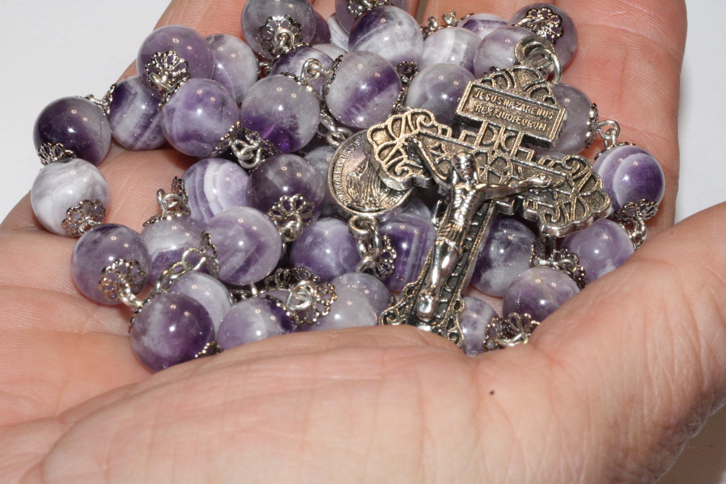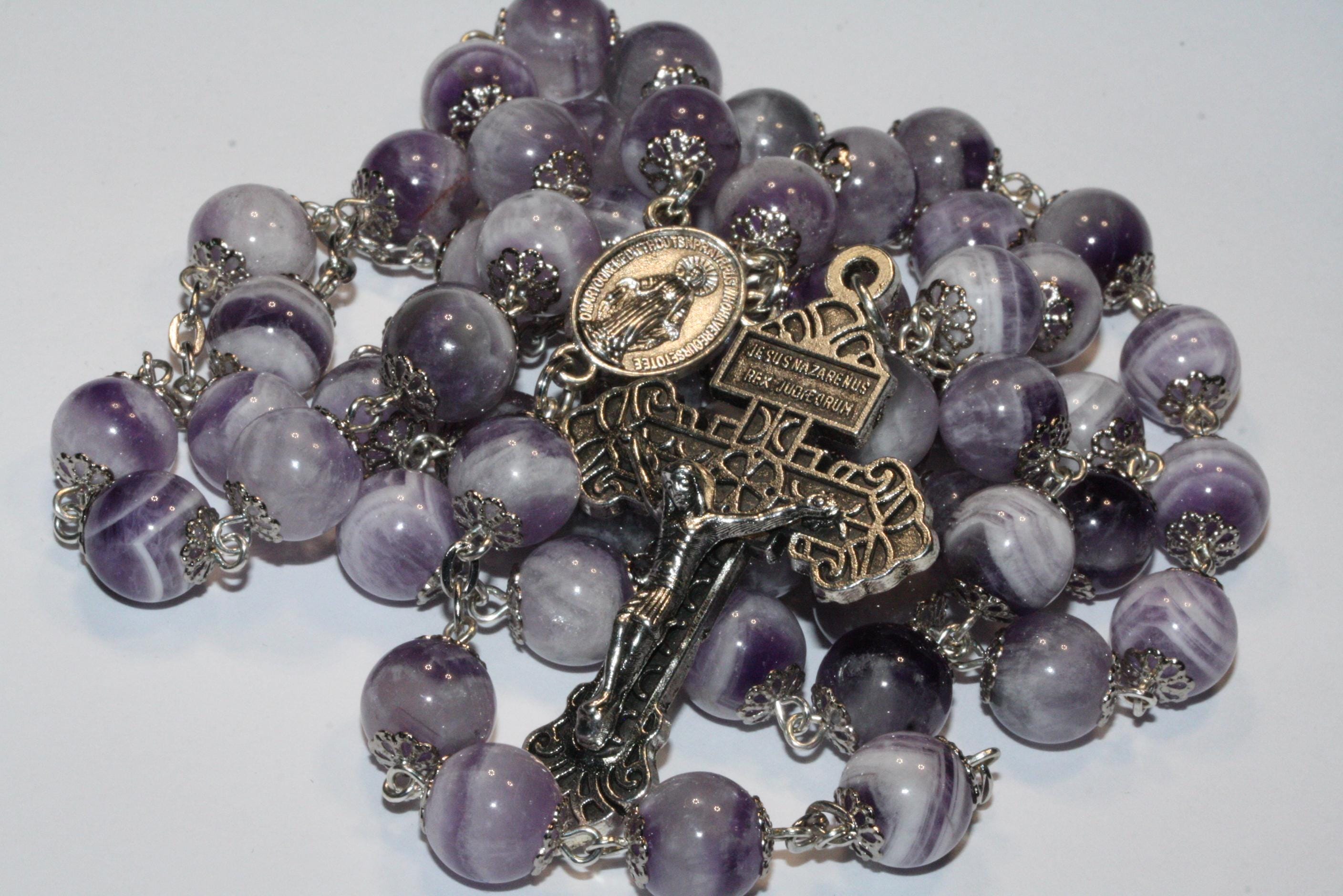 This beautiful handmade rosary crafted in Oklahoma is made of large 10mm or 3/4 inch non-faceted Lavender amethyst (a mixture of amethyst and quartz). The Huge Pardon cross measures 2 1/8 inches and is really stunning. Finished with a beautiful Madonna center also in copper tone pewter, this rosary is large enough to hang on the wall for display or carry. This is larger than the standard rosary and easier for arthritic hands to hold. The natural stones actually warms up when you hold them. The rosary is heirloom quality and may be passed down for many generations. All our rosaries carry a lifetime warranty and 100% satisfaction guarantee. A velveteen carrying bag with an attached handmade charm included.