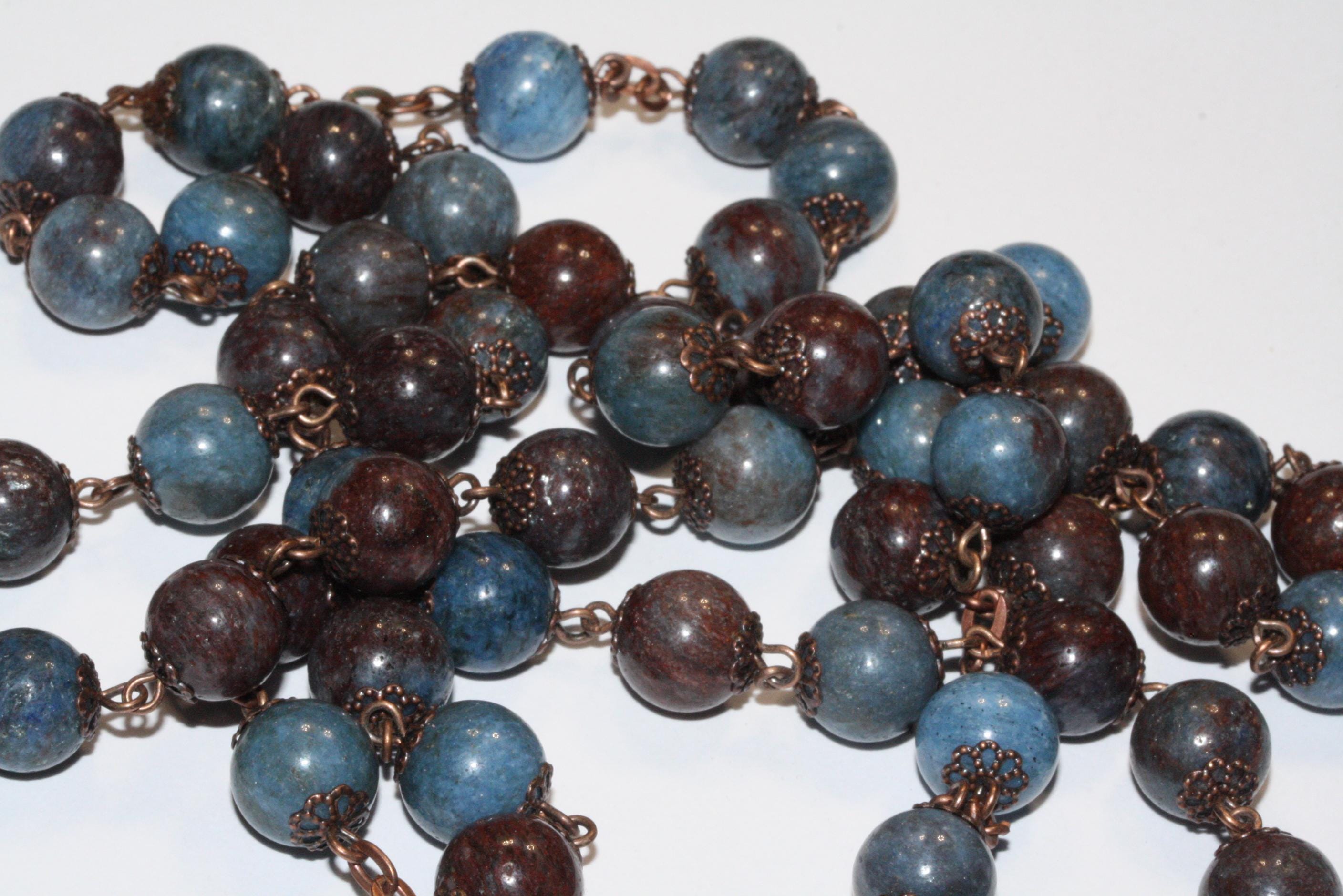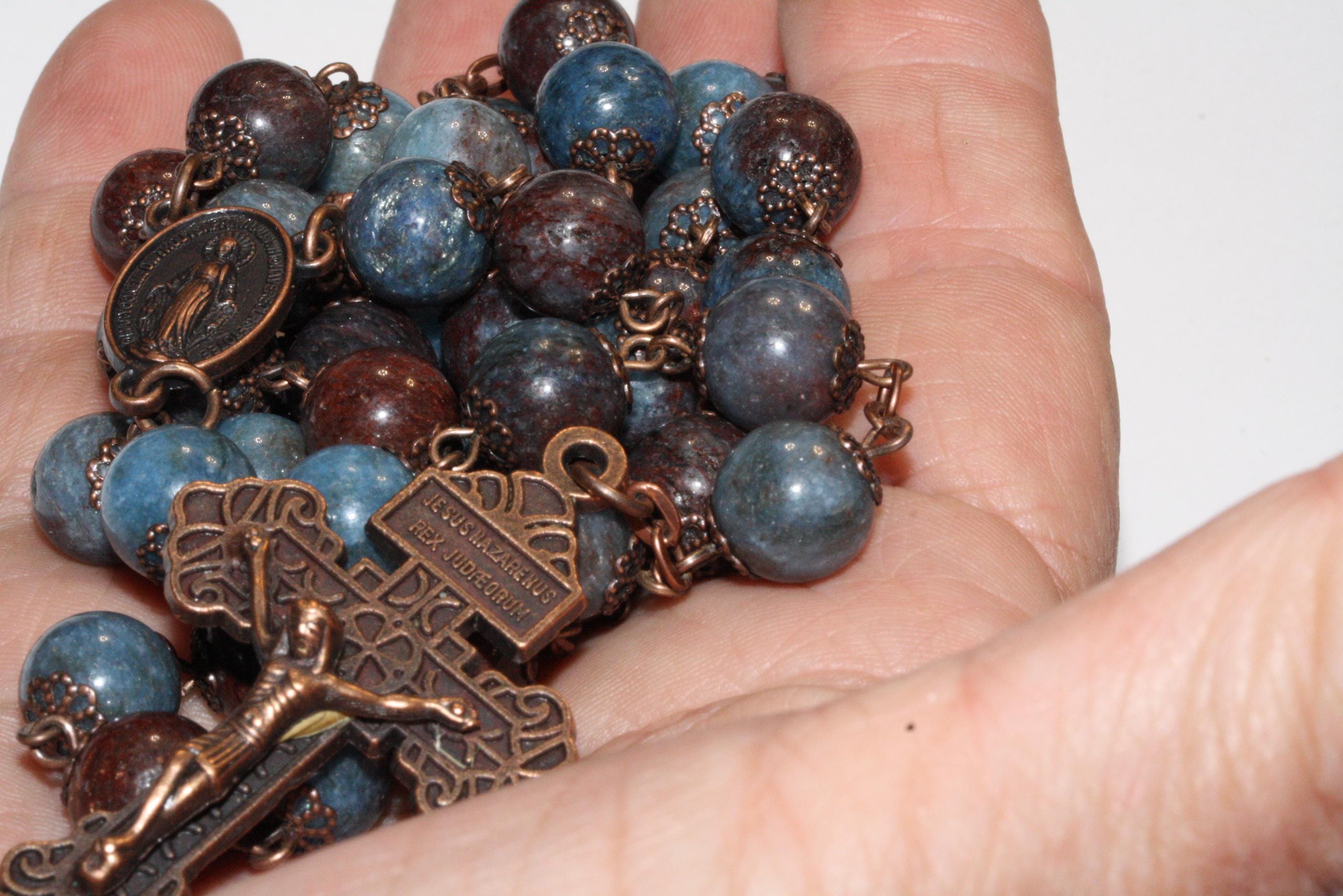 10mm Blue and Brown Jasper Rosary in Copper Handmade in Oklahoma 5 decade Pardon Crucifix
