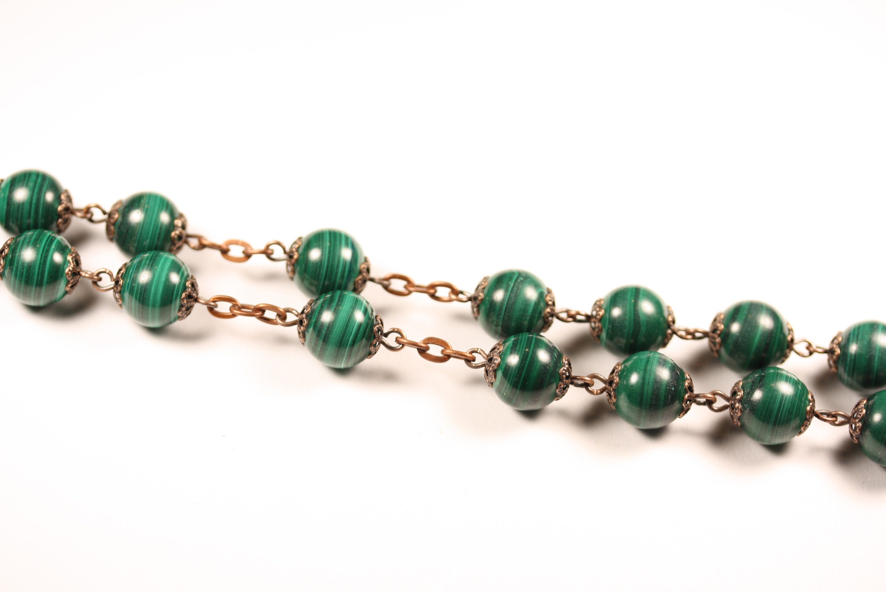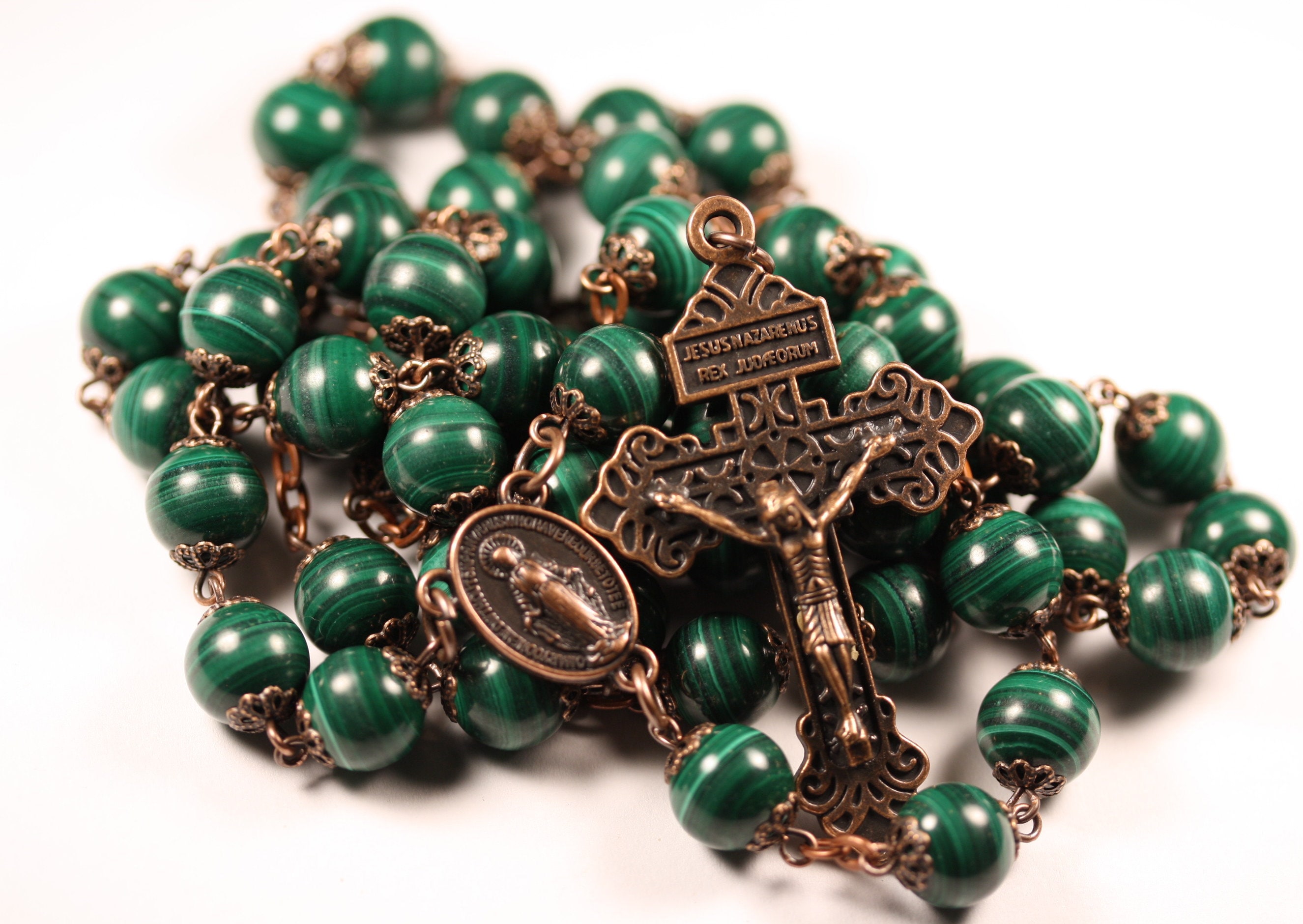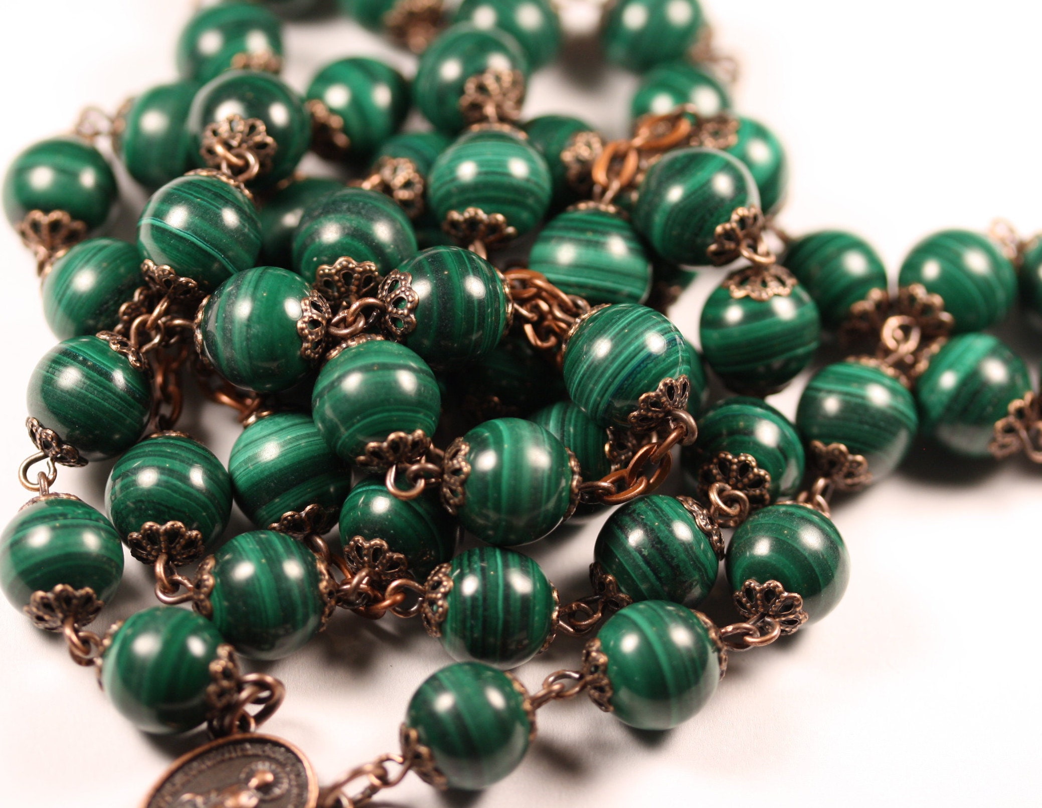10mm Malachite Rosary in Copper with Pardon Crucifix made in Oklahoma