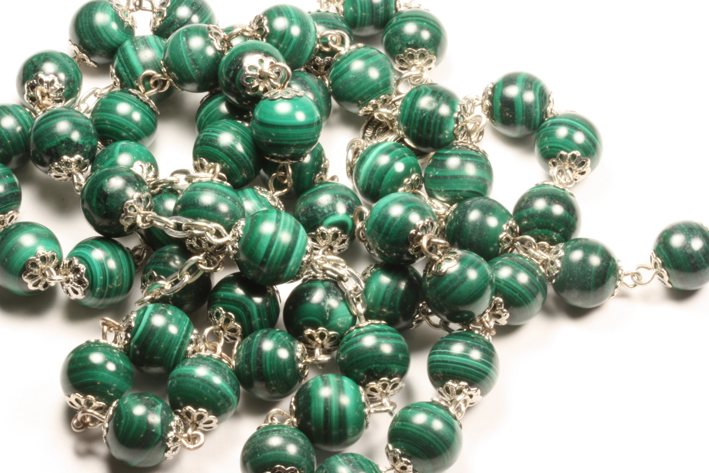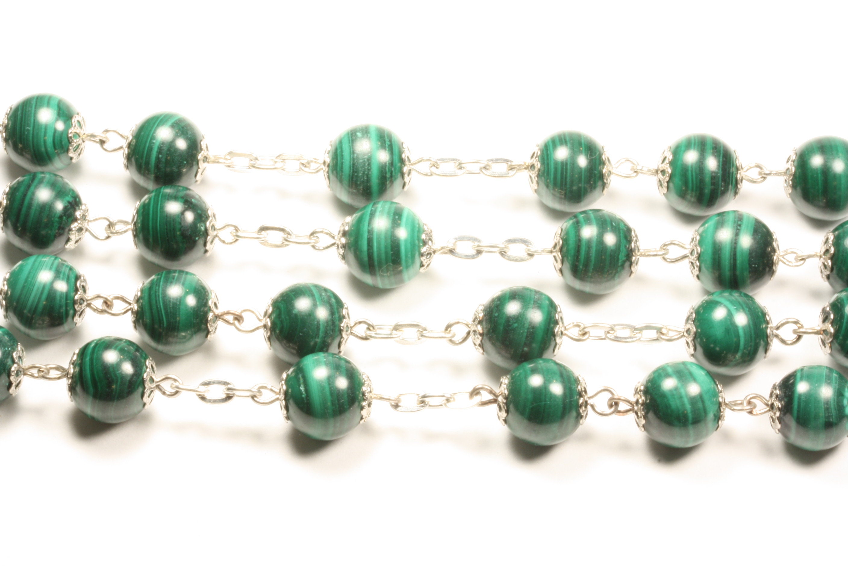Malachite is an opaque, green stone that consists of copper carbonate and hydroxide. It is found in underground spaces throughout the world, including Russia, Europe, Africa and the United States. The beautiful green banded stone is a traditional favorite. This beautiful handmade 5 decade rosary crafted in Oklahoma is made of large 10mm nonfaceted stones. The large crucifix is 2 1/8 inches tall. This rosary is finished with a beautiful Silver tone Our Lady of Guadalupe center. The chain, wires, and caps are steel plated in a silver color giving this rosary great strength and durability.