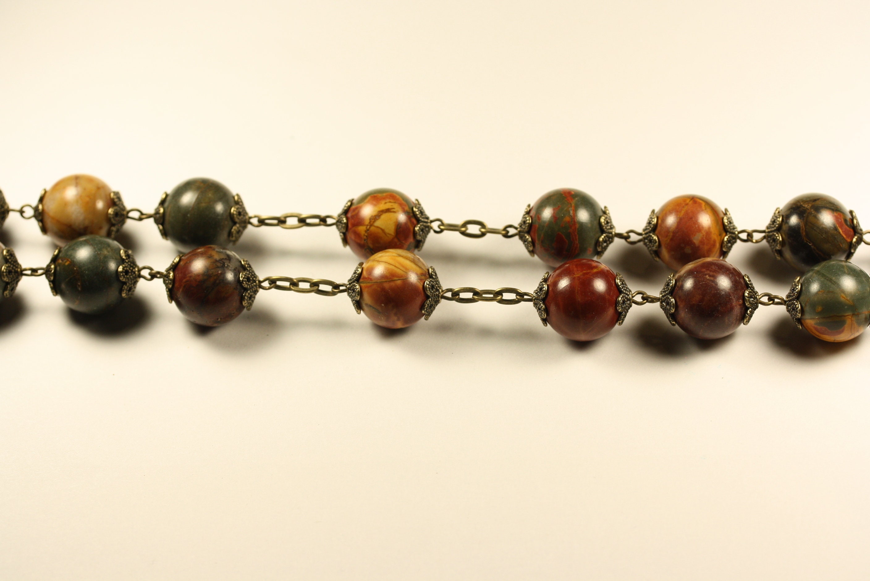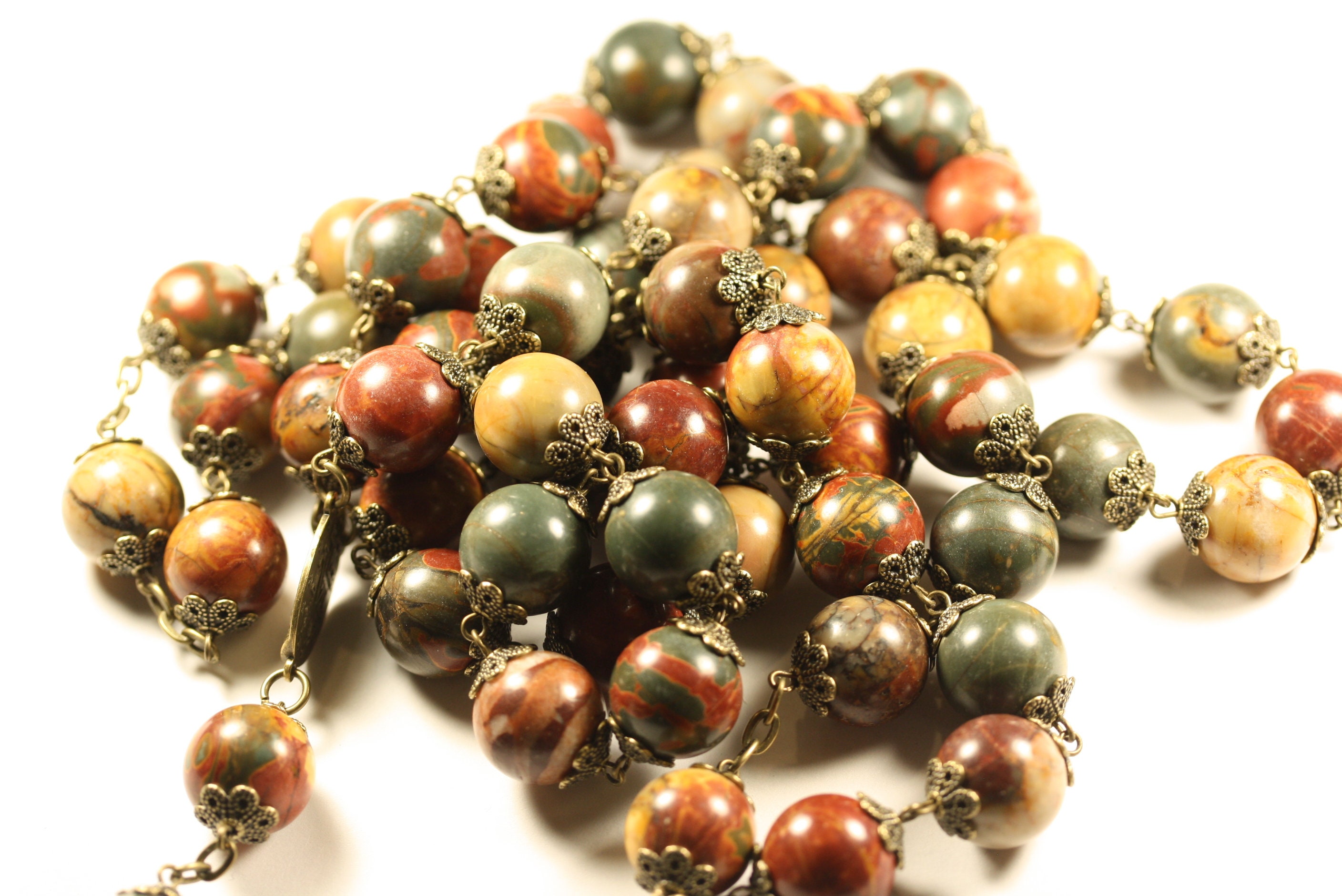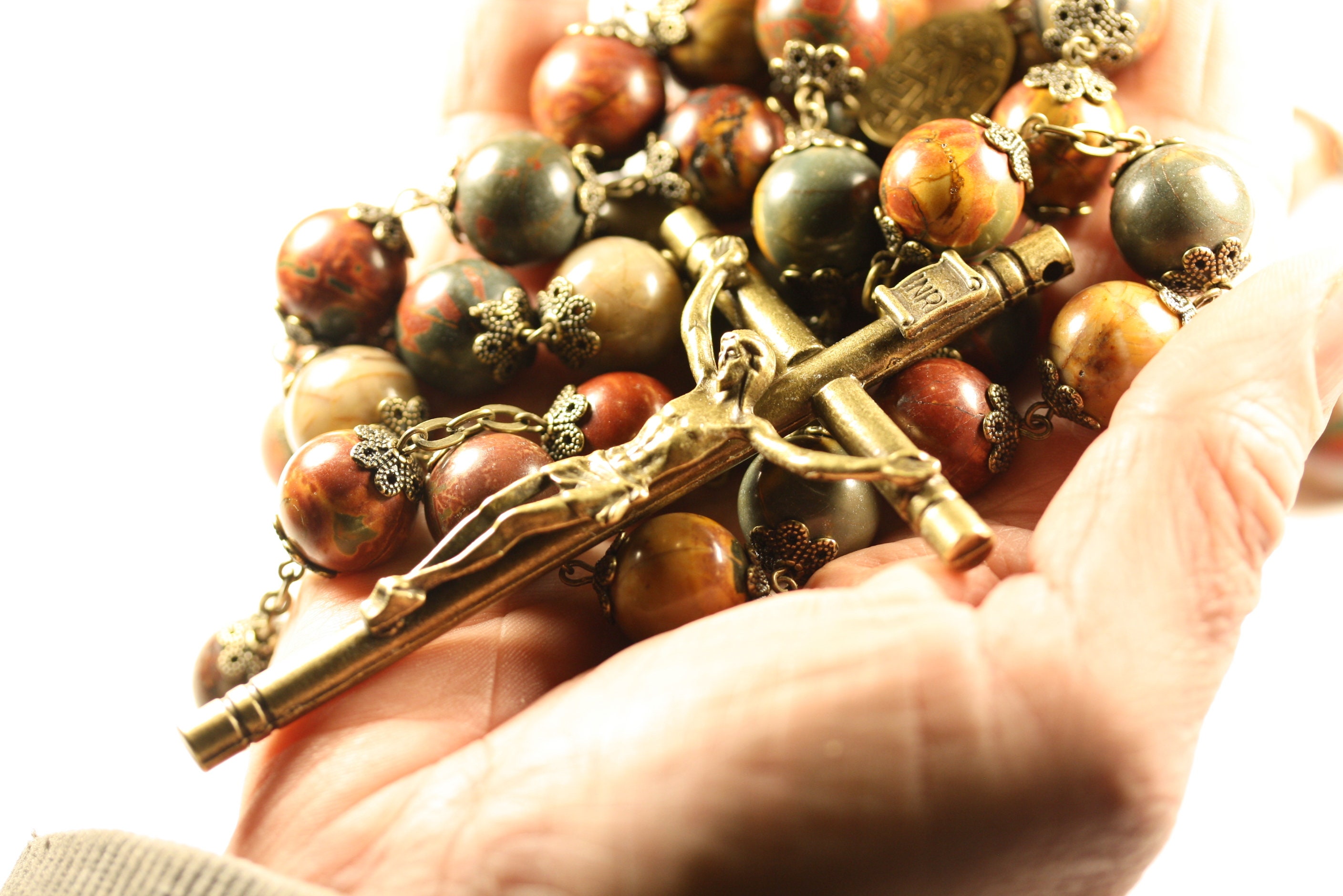 This enormous 14mm stone bead rosary accented in ornate bronze bead caps and finished with a deluxe 4 inch Crucifix will decorate and inspire any living space.